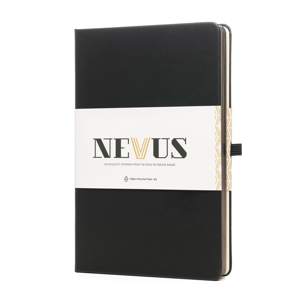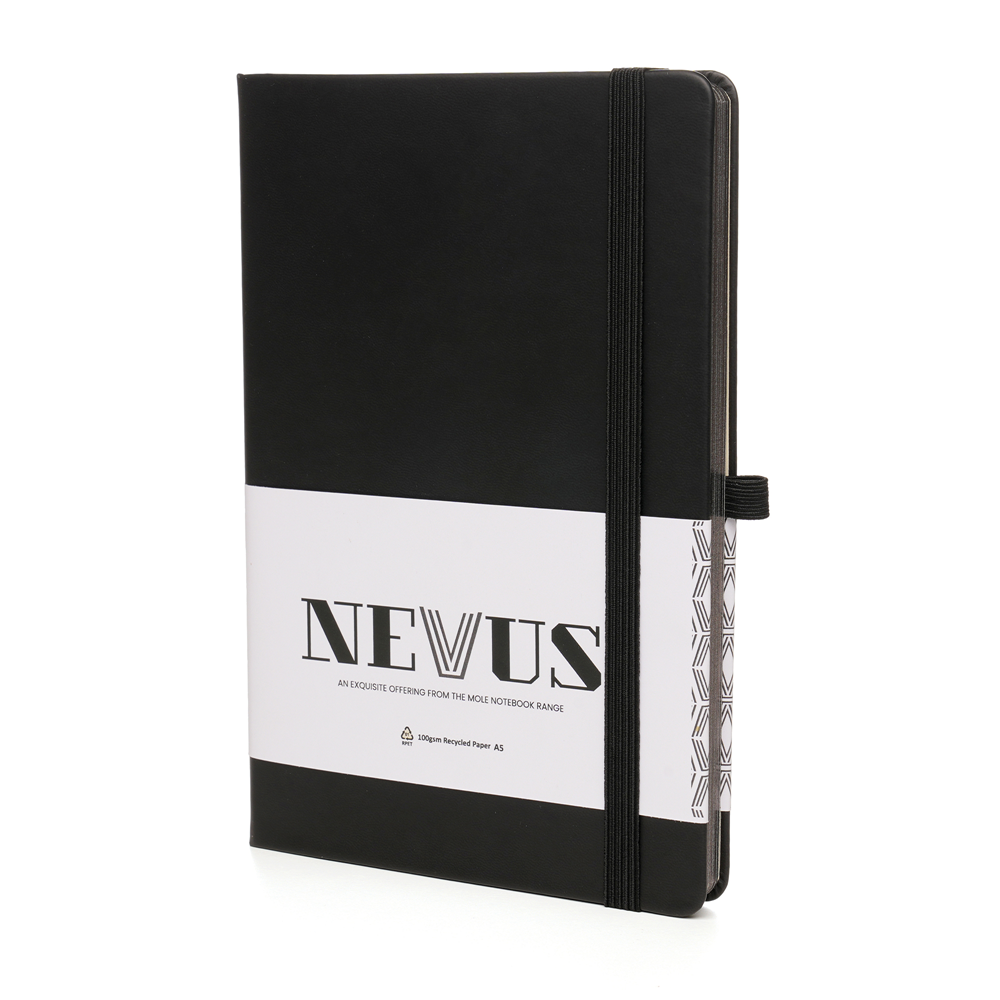 A Premium A5 Nevus notebook that gives back! The outer cover is made from Recycled PU and features a sturdy 950gsm recycled cardboard inner cover, ensuring durability while reducing environmental impact. Inside, you will find 80 perforated sheets of 100gsm cream recycled paper featuring gun metal edging for a premium touch, each lined for neat and organised note-taking. To enhance functionality, this notebook is equipped with a convenient back pocket for storing loose papers and notes. It also comes with polyester double ribbons, providing markers for easy page reference. The elastic band closure secures your notes and keeps everything in place, while the pen loop with gun metal stud ensures you always have a writing instrument at hand. Whether for work, school, or personal use, this notebook is a perfect giveaway and an ideal promotional tool for any occasion and business. In addition to its practicality and recycled materials, this notebook also gives back. For every purchase made, 10p is donated to the 'Helping Uganda Schools Charity', supporting a great cause while you jot down your thoughts and ideas. Make a difference with every page you fill in this thoughtfully designed notebook. Order yours today!