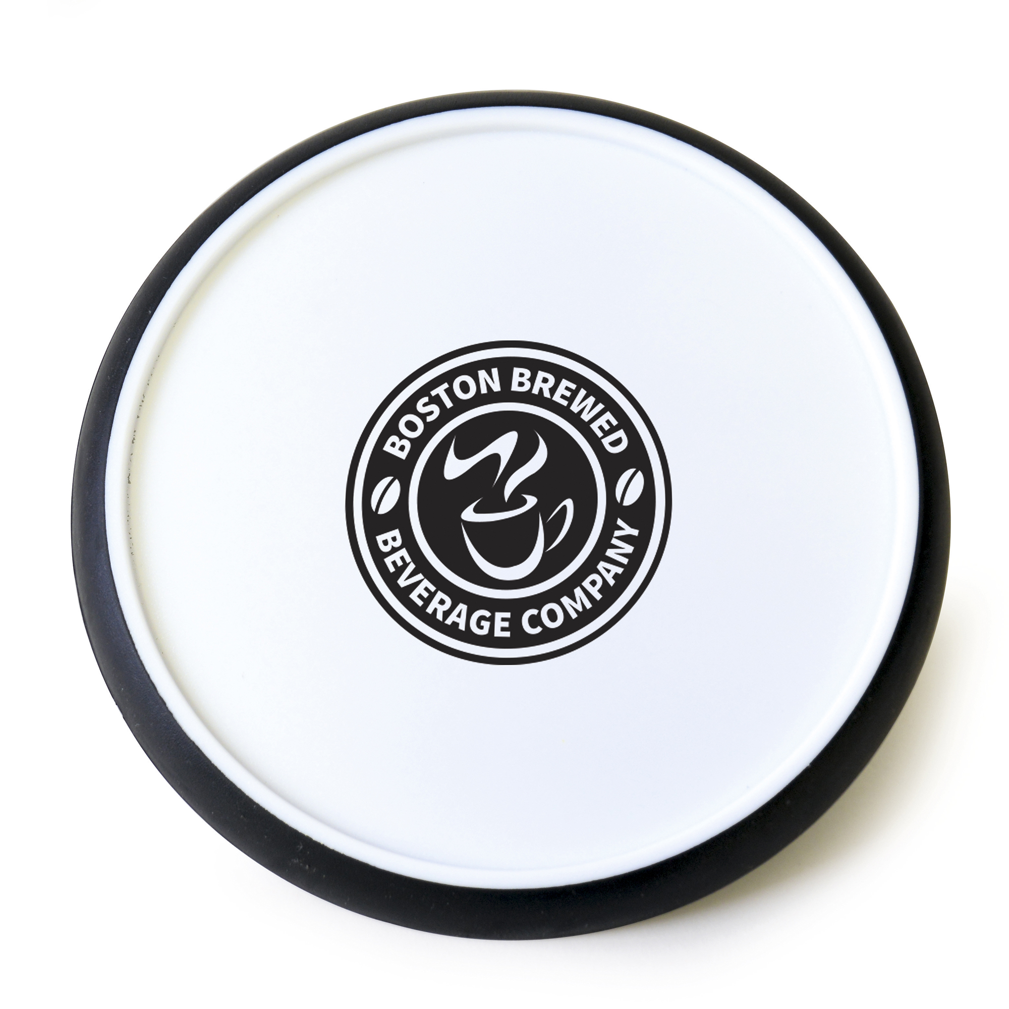 Circular white plastic coaster with coloured silicone edge for a better grip.